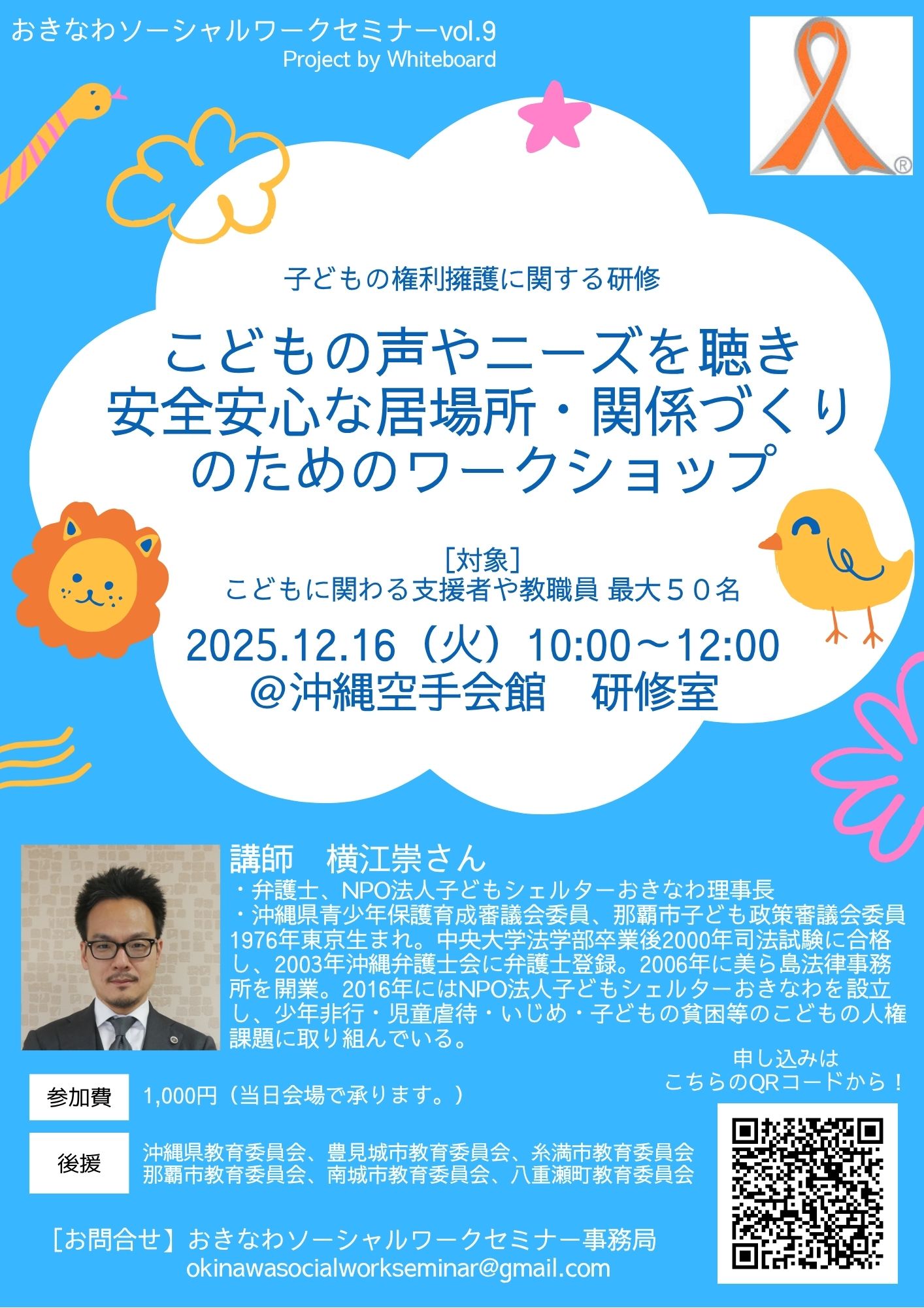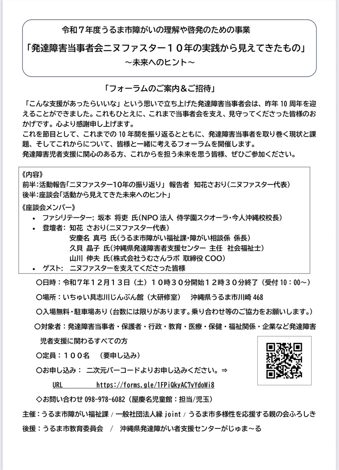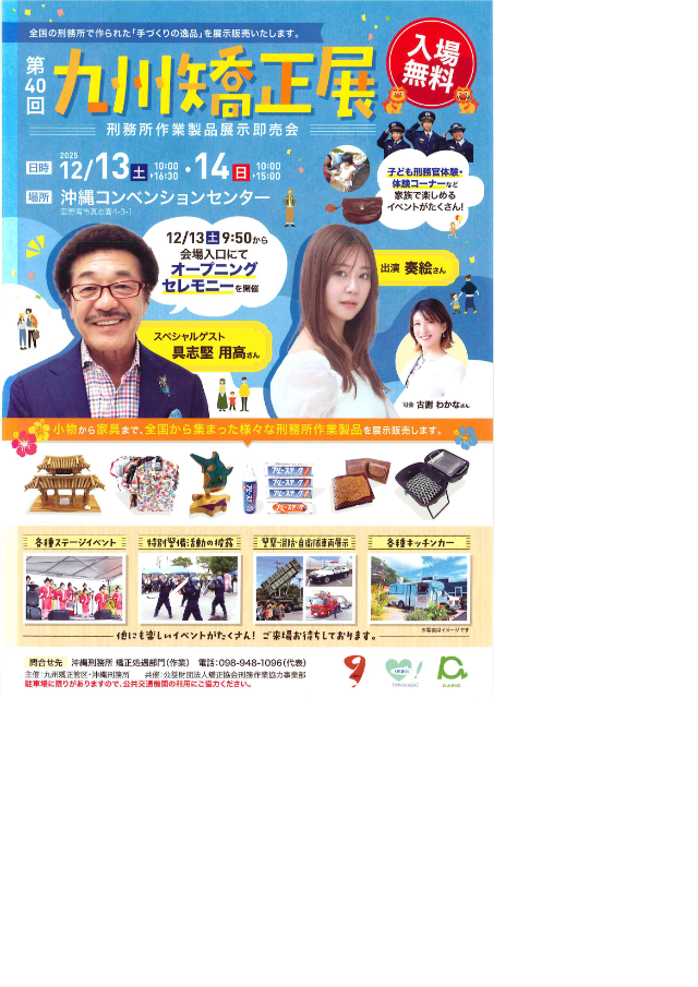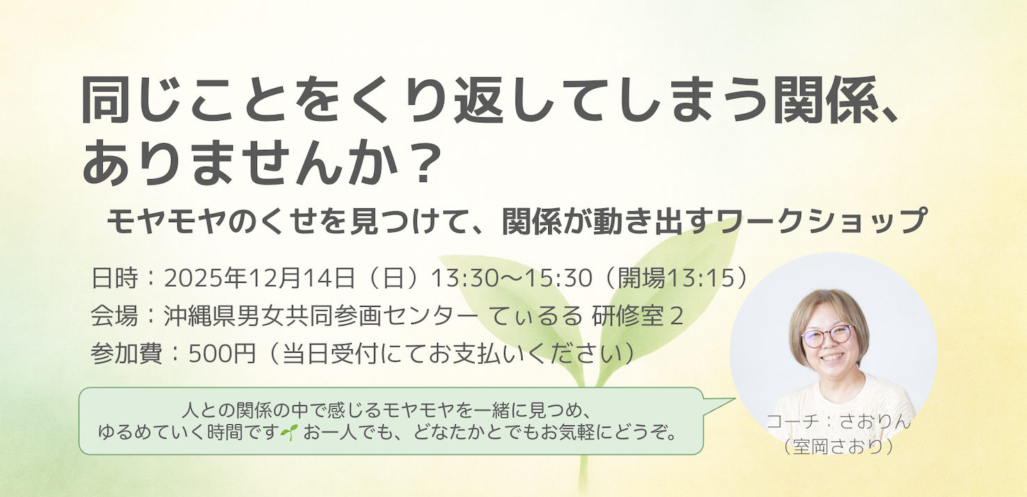 TOP イベント イベント すべて 12月 2026年1月 2月 現在の登録イベントは全部で25件です 開催中 展示・アート 浦添市 令和7年度第2期常設展「アジア世果報(ゆがふ)-アジアと沖縄の漆文化-」 開催期間 2025.09.14 ~2026.01.15 会場 浦添市美術館 開催中 セミナー 那覇市 シニアのための防災✖️健康教室 (那覇市民限定) 開催期間 2025.10.01 ~2025.12.10 会場 小禄自治会館 開催中 展示・アート 沖縄市 2026年度版カレンダー原画展 開催期間 2025.11.19 ~2026.01.26 会場 BOKUNEN ART GALLERY 体験 那覇市 Out of KidZania in なは 2025 開催期間 2025.12.13 ~2025.12.14 会場 那覇市民体育館 メインアリーナ その他(イベント) 那覇市 沖縄ダブル成人式2025 開催期間 2026.01.11 会場 ノボテル沖縄那覇 その他(イベント) うるま市 発達障害当事者会ニヌファスター10年の実践から見えてきたもの 開催期間 2025.12.13 会場 いちゅい具志川じんぶん館 その他(イベント) 那覇市 心と体が喜ぶ癒しフェスティバル沖縄 開催期間 2025.12.06 会場 沖縄県男女共同参画センターてぃるる ホール 体験 八重瀬町 第17回料理体験教室 クリスマスプレートを作ろう 開催期間 2025.12.21 会場 南の駅やえせ ライブ・公演 沖縄市 おきなわ音楽月間|まちなかLIVE Vol.05 開催期間 2025.12.05 会場 コザ・ミュージックタウン1階音楽広場 ライブ・公演 沖縄市 おきなわ音楽月間|まちなかLIVE Vol.06 開催期間 2025.12.12 会場 コザ・ミュージックタウン1階音楽広場前 その他(イベント) 宜野湾市 沖縄県つながりサポート支援事業 トータルビューティー&生活支援等相談会 開催期間 2025.12.06 ~2025.12.07 会場 沖縄コンベンションセンター 会議棟A セミナー 豊見城市 子どもの権利ワークショップ 開催期間 2025.12.16 会場 沖縄空手会館 ライブ・公演 沖縄市 MUSIC POWER 2025 開催期間 2025.12.21 会場 コザ・ミュージックタウン1階音楽広場 開催中 季節のイベント 八重瀬町 あざまサンサンビーチ・イルミネーション2025 開催期間 2025.11.15 ~2026.01.03 会場 あざまサンサンビーチ ライブ・公演 那覇市 演劇ユニット1998 第1回企画公演 「神はサイコロを振り続けても -GOD’S ALGORITHM- 」 開催期間 2025.12.13 ~2025.12.14 会場 アトリエ銘苅ベース ライブ・公演 宜野湾市 第24回芸能チャリティ公演 開催期間 2025.12.14 会場 沖縄コンベンションセンター劇場棟 セミナー 那覇市 同じことをくり返してしまう関係、ありませんか? - モヤモヤのくせを見つけて、関係が動き出すワークショップ 開催期間 2025.12.14 会場 沖縄県男女共同参画センター てぃるる 研修室2 その他(イベント) 浦添市 戦後80年企画「前田高地の戦跡巡り~戦争の現場を見る~」 開催期間 2025.12.14 会場 浦添グスクようどれ館 その他(イベント) 宜野湾市 第40回九州矯正展 開催期間 2025.12.13 ~2025.12.14 会場 沖縄コンベンションセンター展示棟 展示・アート 那覇市 えだま展 vol.12 開催期間 2025.12.17 ~2025.12.23 会場 curiosities okinawa 展示・アート 浦添市 浦添市美術館開館35周年特別展「貝摺奉行所展(かいずりぶぎょうしょてん)」 開催期間 2026.01.23 ~2026.03.08 会場 浦添市美術館 体験 沖縄市 奈良県「saredoの糸と靴下」関連イベント saredoのダーニングワークショップ 開催期間 2026.01.24 会場 D&DEPARTMENT OKINAWA by PLAZA 3 セミナー 浦添市 令和7年度第2期常設展講座「沖縄に根付いた外来文化の受容と変容」 開催期間 2026.01.11 会場 浦添市美術館 講堂 ライブ・公演 沖縄市 Co-The Gate 2025 〜music session〜 開催期間 2025.12.14 会場 ミュージックタウン1階音楽広場 開催中 季節のイベント 読谷村 琉球ランタンフェスティバル2025-2026 開催期間 2025.12.01 ~2026.03.31 会場 体験王国むら咲むら 現在の登録イベントは全部で21件です 開催中 展示・アート 浦添市 令和7年度第2期常設展「アジア世果報(ゆがふ)-アジアと沖縄の漆文化-」 開催期間 2025.09.14 ~2026.01.15 会場 浦添市美術館 開催中 セミナー 那覇市 シニアのための防災✖️健康教室 (那覇市民限定) 開催期間 2025.10.01 ~2025.12.10 会場 小禄自治会館 開催中 展示・アート 沖縄市 2026年度版カレンダー原画展 開催期間 2025.11.19 ~2026.01.26 会場 BOKUNEN ART GALLERY 体験 那覇市 Out of KidZania in なは 2025 開催期間 2025.12.13 ~2025.12.14 会場 那覇市民体育館 メインアリーナ その他(イベント) うるま市 発達障害当事者会ニヌファスター10年の実践から見えてきたもの 開催期間 2025.12.13 会場 いちゅい具志川じんぶん館 その他(イベント) 那覇市 心と体が喜ぶ癒しフェスティバル沖縄 開催期間 2025.12.06 会場 沖縄県男女共同参画センターてぃるる ホール 体験 八重瀬町 第17回料理体験教室 クリスマスプレートを作ろう 開催期間 2025.12.21 会場 南の駅やえせ ライブ・公演 沖縄市 おきなわ音楽月間|まちなかLIVE Vol.05 開催期間 2025.12.05 会場 コザ・ミュージックタウン1階音楽広場 ライブ・公演 沖縄市 おきなわ音楽月間|まちなかLIVE Vol.06 開催期間 2025.12.12 会場 コザ・ミュージックタウン1階音楽広場前 その他(イベント) 宜野湾市 沖縄県つながりサポート支援事業 トータルビューティー&生活支援等相談会 開催期間 2025.12.06 ~2025.12.07 会場 沖縄コンベ