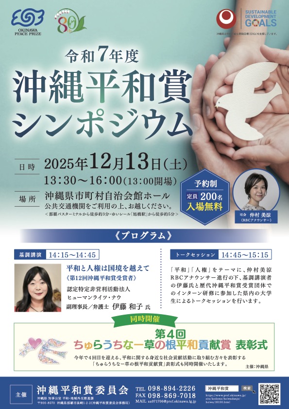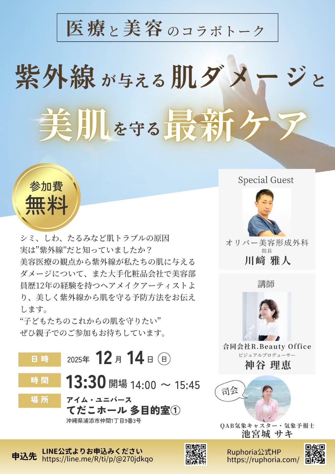 TOP イベント イベント すべて 12月 2026年1月 2月 現在の登録イベントは全部で33件です 開催中 展示・アート 浦添市 令和7年度第2期常設展「アジア世果報(ゆがふ)-アジアと沖縄の漆文化-」 開催期間 2025.09.14 ~2026.01.15 会場 浦添市美術館 開催中 展示・アート 沖縄市 2026年度版カレンダー原画展 開催期間 2025.11.19 ~2026.01.26 会場 BOKUNEN ART GALLERY 体験 那覇市 Out of KidZania in なは 2025 開催期間 2025.12.13 ~2025.12.14 会場 那覇市民体育館 メインアリーナ その他(イベント) 那覇市 沖縄ダブル成人式2025 開催期間 2026.01.11 会場 ノボテル沖縄那覇 その他(イベント) うるま市 発達障害当事者会ニヌファスター10年の実践から見えてきたもの 開催期間 2025.12.13 会場 いちゅい具志川じんぶん館 体験 八重瀬町 第17回料理体験教室 クリスマスプレートを作ろう 開催期間 2025.12.21 会場 南の駅やえせ ライブ・公演 沖縄市 おきなわ音楽月間|まちなかLIVE Vol.06 開催期間 2025.12.12 会場 コザ・ミュージックタウン1階音楽広場前 セミナー 豊見城市 子どもの権利ワークショップ 開催期間 2025.12.16 会場 沖縄空手会館 ライブ・公演 沖縄市 MUSIC POWER 2025 開催期間 2025.12.21 会場 コザ・ミュージックタウン1階音楽広場 開催中 季節のイベント 八重瀬町 あざまサンサンビーチ・イルミネーション2025 開催期間 2025.11.15 ~2026.01.03 会場 あざまサンサンビーチ ライブ・公演 那覇市 演劇ユニット1998 第1回企画公演 「神はサイコロを振り続けても -GOD’S ALGORITHM- 」 開催期間 2025.12.13 ~2025.12.14 会場 アトリエ銘苅ベース ライブ・公演 宜野湾市 第24回芸能チャリティ公演 開催期間 2025.12.14 会場 沖縄コンベンションセンター劇場棟 セミナー 那覇市 同じことをくり返してしまう関係、ありませんか? - モヤモヤのくせを見つけて、関係が動き出すワークショップ 開催期間 2025.12.14 会場 沖縄県男女共同参画センター てぃるる 研修室2 その他(イベント) 浦添市 戦後80年企画「前田高地の戦跡巡り~戦争の現場を見る~」 開催期間 2025.12.14 会場 浦添グスクようどれ館 その他(イベント) 宜野湾市 第40回九州矯正展 開催期間 2025.12.13 ~2025.12.14 会場 沖縄コンベンションセンター展示棟 展示・アート 那覇市 えだま展 vol.12 開催期間 2025.12.17 ~2025.12.23 会場 curiosities okinawa 展示・アート 浦添市 浦添市美術館開館35周年特別展「貝摺奉行所展(かいずりぶぎょうしょてん)」 開催期間 2026.01.23 ~2026.03.08 会場 浦添市美術館 体験 沖縄市 奈良県「saredoの糸と靴下」関連イベント saredoのダーニングワークショップ 開催期間 2026.01.24 会場 D&DEPARTMENT OKINAWA by PLAZA 3 セミナー 浦添市 令和7年度第2期常設展講座「沖縄に根付いた外来文化の受容と変容」 開催期間 2026.01.11 会場 浦添市美術館 講堂 ライブ・公演 沖縄市 Co-The Gate 2025 〜music session〜 開催期間 2025.12.14 会場 ミュージックタウン1階音楽広場 開催中 季節のイベント 読谷村 琉球ランタンフェスティバル2025-2026 開催期間 2025.12.01 ~2026.03.31 会場 体験王国むら咲むら ライブ・公演 浦添市 バリが繋いだHarmony ガムランと舞踊公演 開催期間 2025.12.21 会場 国立劇場おきなわ小劇場 開催中 季節のイベント 伊是名村 しまのイルミネーション/伊是名島 開催期間 2025.12.07 ~2026.01.16 会場 伊是名村臨海ふれあい公園 その他(イベント) 恩納村 防災キャンプ 開催期間 2026.01.17 ~2026.01.18 会場 沖縄県県民の森 セミナー 那覇市 琉球家譜より 開催期間 2026.01.24 会場 沖縄県男女共同参画センター3階(研修室) その他(イベント) 南風原町 令和7年度障がいのある方々のデンタルフェア 開催期間 2026.02.05 会場 沖縄県口腔保健医療センター ライブ・公演 那覇市 海上自衛隊佐世保音楽隊音楽演奏会『音楽の夕べ』 開催期間 2026.02.21 会場 那覇文化芸術劇場なはーと 季節のイベント 糸満市 くくるのHappy christmas 開催期間 2025.12.20 ~2025.12.21 会場 糸満市観光文化交流拠点施設くくる糸満 展示・アート 名護市 ねこやすみ展 開催期間 2025.12.19 ~2026.01.19 会場 地中海料理restaurant雲茶 その他(イベント) 浦添市 令和7年度「石獅子講座・ワークショップ」 開催期間 2026.01.25 会場 浦添市美術館ピロティ セミナー 浦添市 医療と美容のコラボトーク【紫外線が与える肌ダメージと美肌を守る最新ケア】 開催期間 2025.12.14 会場 てだこホール 多目的室① その他(イベント) 北谷町 ママとベビー&キッズのためのイベントゆるり 開催期間 2026.01.06 ~2026.01.08 会場 サンエーハンビータウン その他(イベント) 那覇市 沖縄平和賞シンポジウム 開催期間 2025.12.13 会場 沖縄県市町村自治会館 現在の登録イベントは全部で23件です 開催中 展示・アート 浦添市 令和7年度第2期常設展「アジア世果報(ゆがふ)-アジアと沖縄の漆文化-」 開催期間 2025.09.14 ~2026.01.15 会場 浦添市美術館 開催中 展示・アート 沖縄市 2026年度版カレンダー原画展 開催期間 2025.11.19 ~2026.01.26 会場 BOKUNEN ART GALLERY 体験 那覇市 Out of KidZania in なは 2025 開催期間 2025.12.13 ~2025.12.14 会場 那覇市民体育館 メインアリーナ その他(イベント) うるま市 発達障害当事者会ニヌファスター10年の