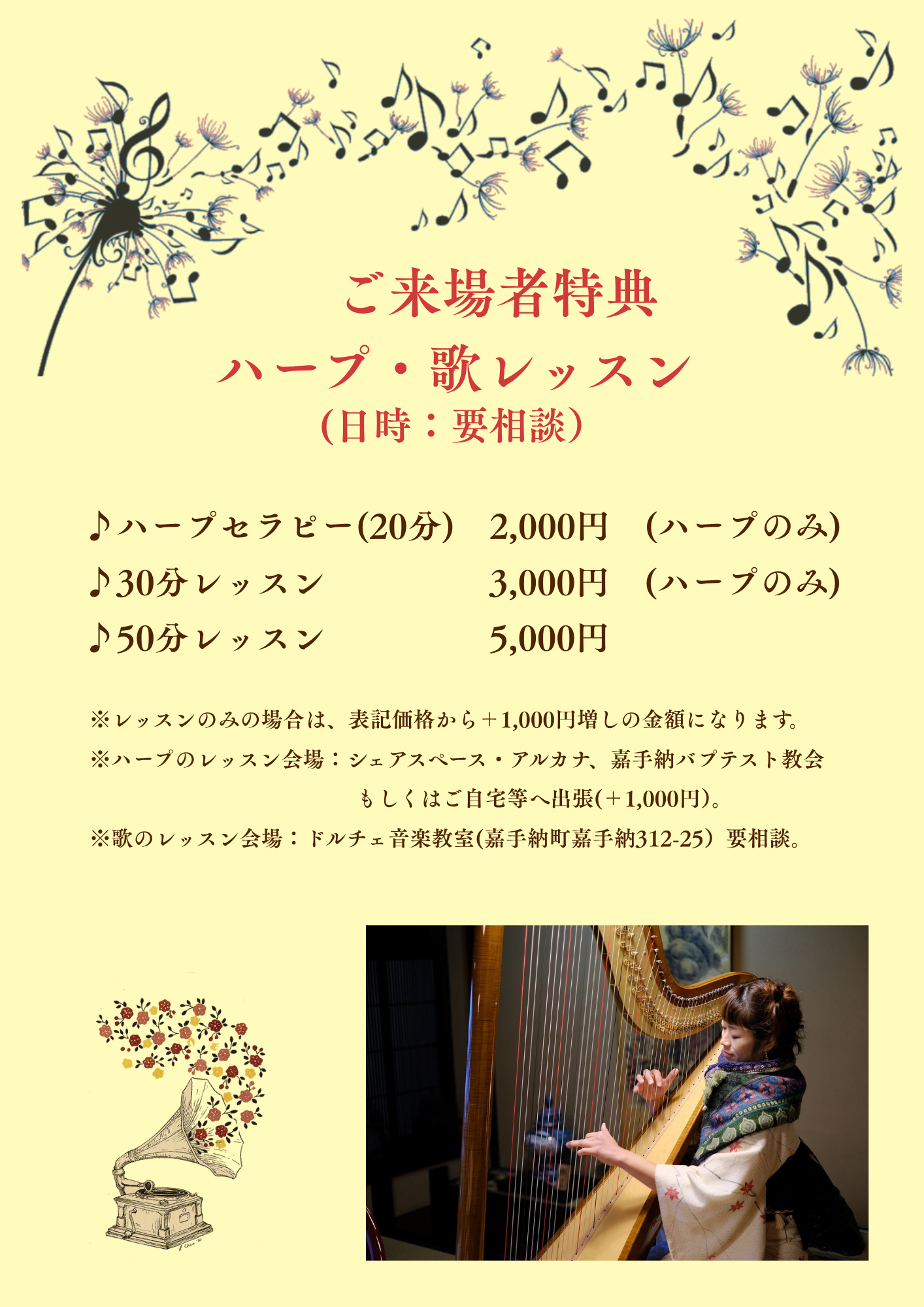 また、今回もハープレッスン受けられますので